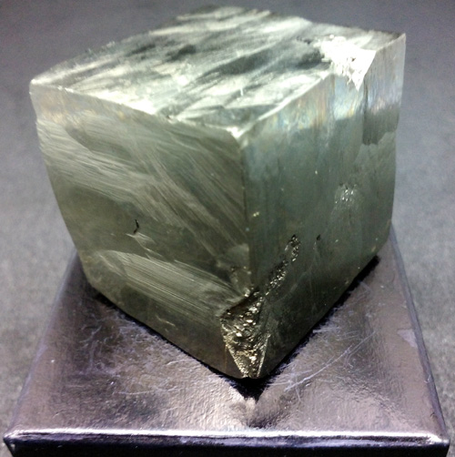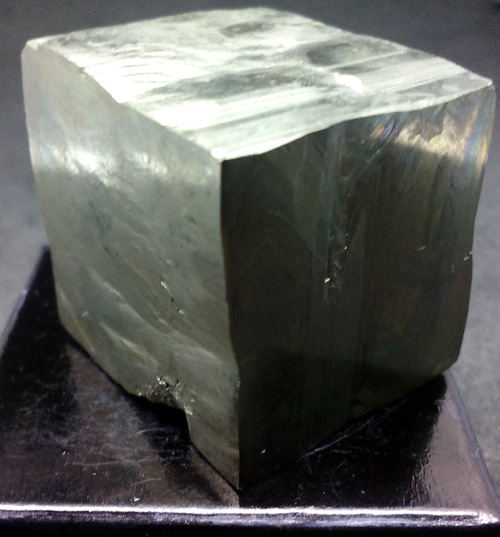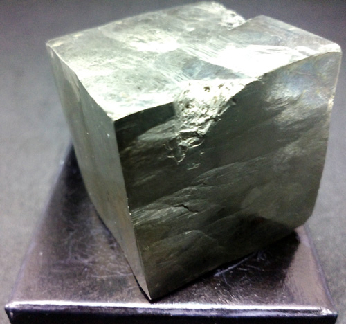 Pyrite cube of 2,3 x 2,4 x 2,6 cm. aprox. Its faces are nice and bright. Presents contact marks with other pyrites. (The dark base measures 4x4 cm.)
