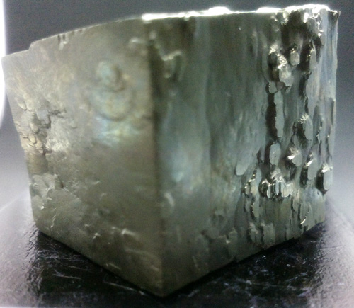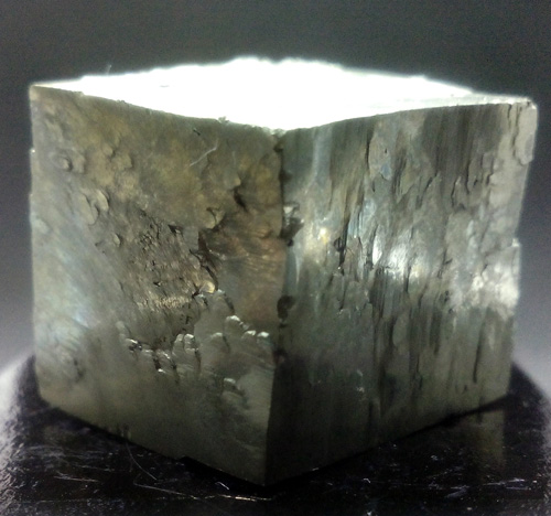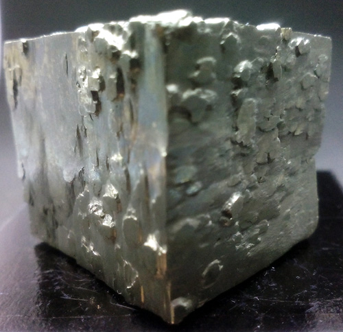 Cubo de pirita de 2 x 2 x 2,1 cm. aprox. Sus caras presentan grandes y raros relieves. (La base negra mide 4x4 cm.)