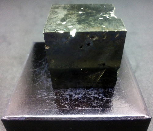 Pyrite cube 1,9 x 1,8 x 1,9 cm. approx. Its faces are smooth and bright. It has several defects. (The dark base measures 4x4 cm.)
