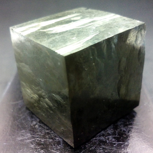 Pyrite cube 1.8 x 1.9 x 1.9 cm. approx. Its faces are smooth and bright. (The dark base measures 4x4 cm.)