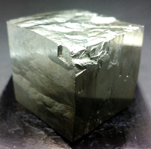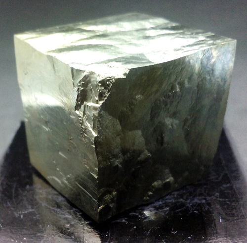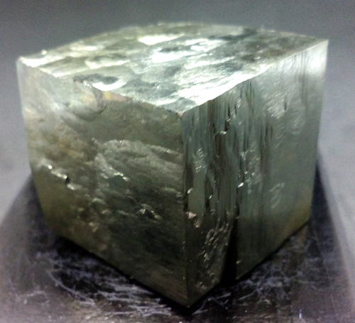 Pyrite cube of 2 x 1.9 x 1.9 cm. approx. Its faces are smooth and bright. (The dark base measures 4x4 cm.)