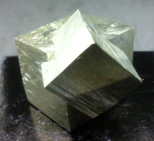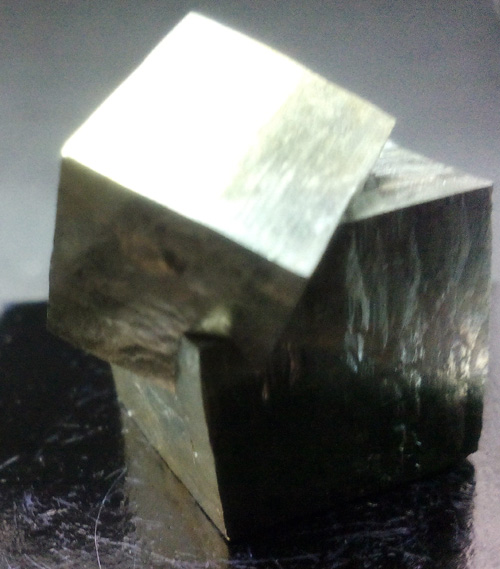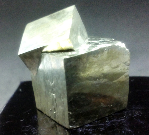 Pyrite twin, the big one is 1,3 x 1,3 x 1,4 cm. approx. Its faces are smooth and bright. (The dark base measures 4x4 cm.)
